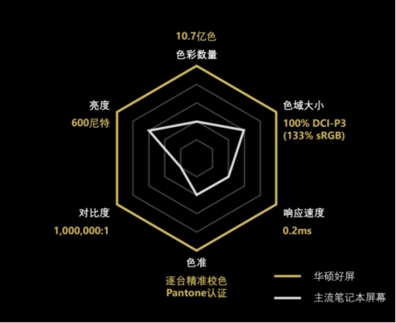 可以说,超能打OLED屏幕带来全新视界。华硕好屏旨在为用户提供行业领先的显示效果,在色彩、亮度、对比度等参数上全方位超越传统笔记本屏幕,下方六边形对比图,涵盖了所有华硕好屏OLED的共同优势。