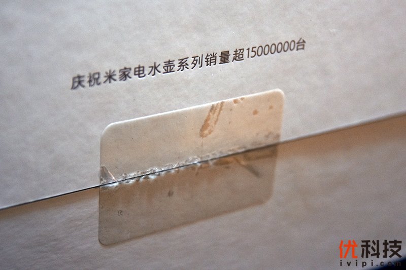 米家电水壶纪念套装的包装采用了标准的上下盖设计,在包装的侧面还贴有贴纸来防护,并且上方还印有“庆祝米家电水壶系列销量超15000000”字样。