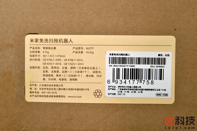 此外米家免洗扫拖机器人的产品规格信息贴纸也是粘贴于包装的侧面,从中可以看出米家免洗扫拖机器人的产品重量以及包装内含物品,分别为主机、清洗站、边刷(备用)说明书、拖布(备用)等等。