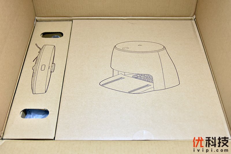 揭开包装上盖可以看到内部的产品分装箱,同时分装箱上还印有内含产品的简图,其中左侧竖置放置的为米家免洗扫拖机器人,右侧较大尺寸的包装箱则为米家免洗扫拖机器人的清洗站。