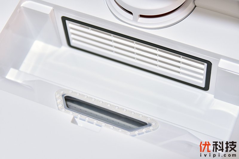 细节设计方面,在米家免洗扫拖机器人尘盒的安装区可以看到进尘口边缘配有密封橡胶条,避免了灰尘进入到米家免洗扫拖机器人的内部,另外在对接尘盒滤芯部分同样配有密封胶条设计。