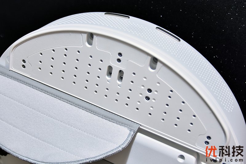 接下来翻面看看米家免洗扫拖机器人的底部工作区,其中可以看到两个较大尺寸的驱动轮以及一个万向轮,另外还配备了四枚悬崖传感器和一个超声波地毯传感器,因为米家免洗扫拖机器人在清扫时遇到地毯可以通过抬升拖布而略过此处的拖地,这个功能可以说是非常的实用了。至于中间则是米家免洗扫拖机器人的扫地毛刷以及滚刷胶条部分,而底部则是用于拖地的拖布。同时机身底部还采用了微磨砂设计,即便是长时间使用也不容易留下划痕。