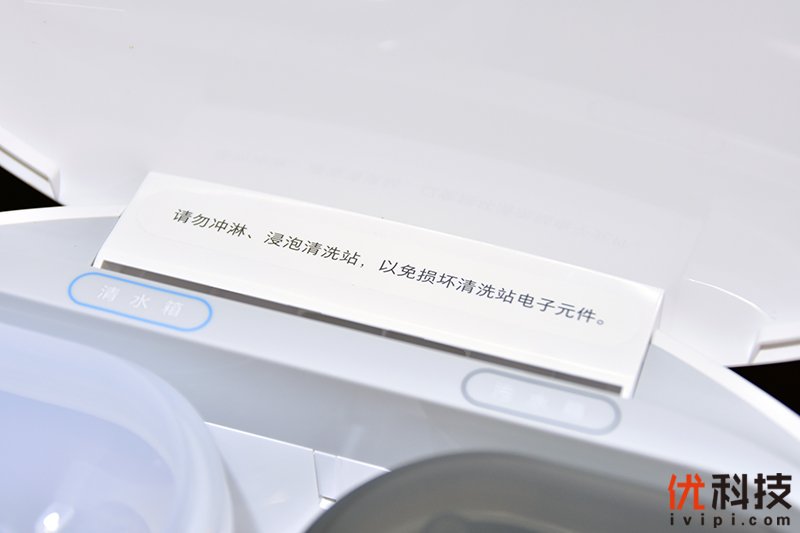 揭开米家免洗扫拖机器人清洗站的上盖可以看到内部配备了两个大容量水箱,其中白色的清水箱,而深色的为污水箱。并且内部还标有“请勿冲淋、浸泡清洗站,以免损坏清洗站电子元件”的提示标语。