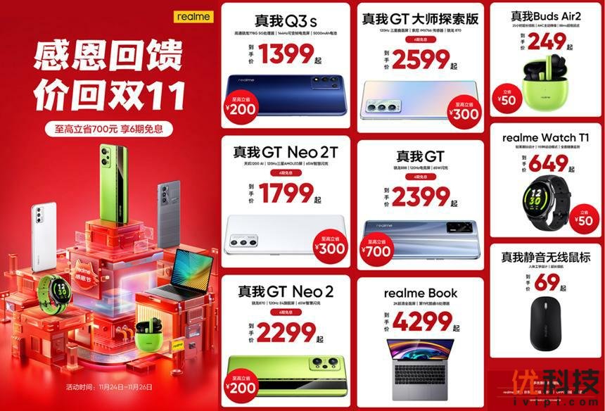 除真我Q3s之外,realme其它全系列王牌产品和AIoT产品也同样感恩节价回双11,真我GT Neo2T到手价仅1799元起、真我GT Neo2到手价仅2299元起、真我GT大师探索版到手价仅2599元起、真我GT更是至高立减700到手价仅2399元,为年轻消费者提供更为多元化的购机选择。