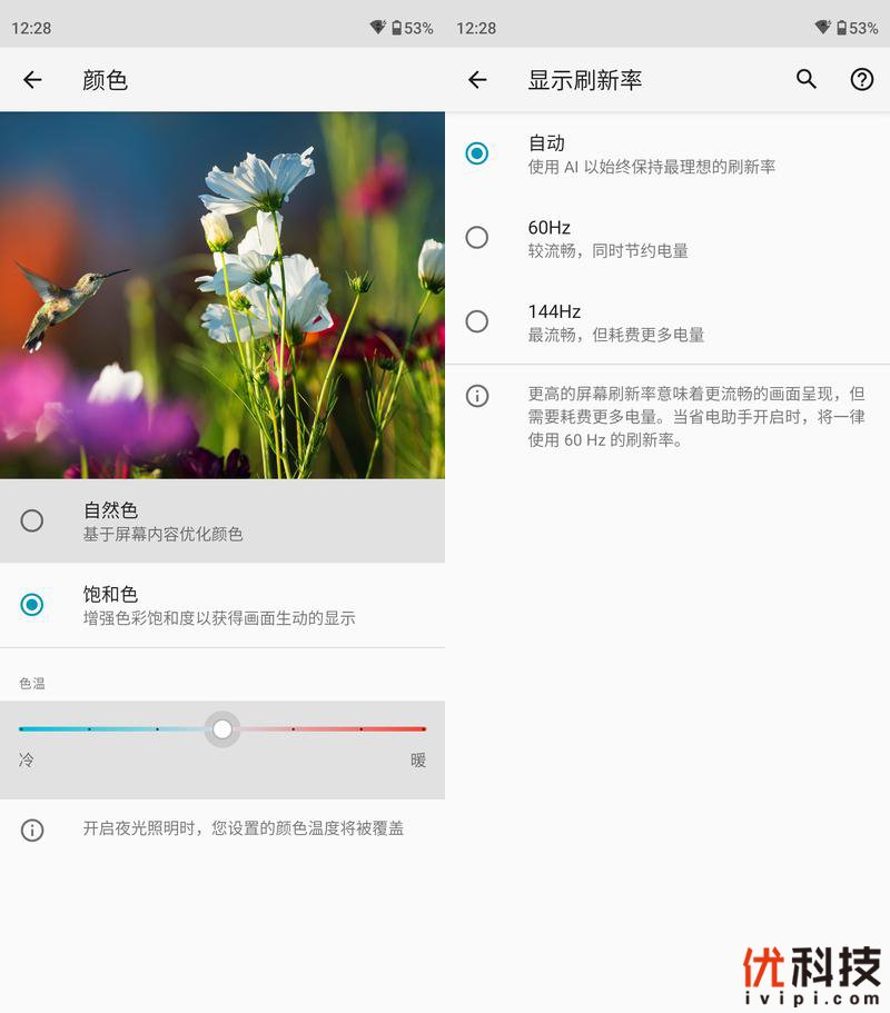 在屏幕色彩显示方面,系统内可以选择自然色和饱和色,根据用户的观感自由选择,并且还支持屏幕色温的手动调节功能,可以让用户提升屏幕观感的舒适性。而屏幕刷新率方面则是具备多档可调功能,最高支持144Hz的屏幕刷新率,但对于续航的考虑还是建议选择自动模式。