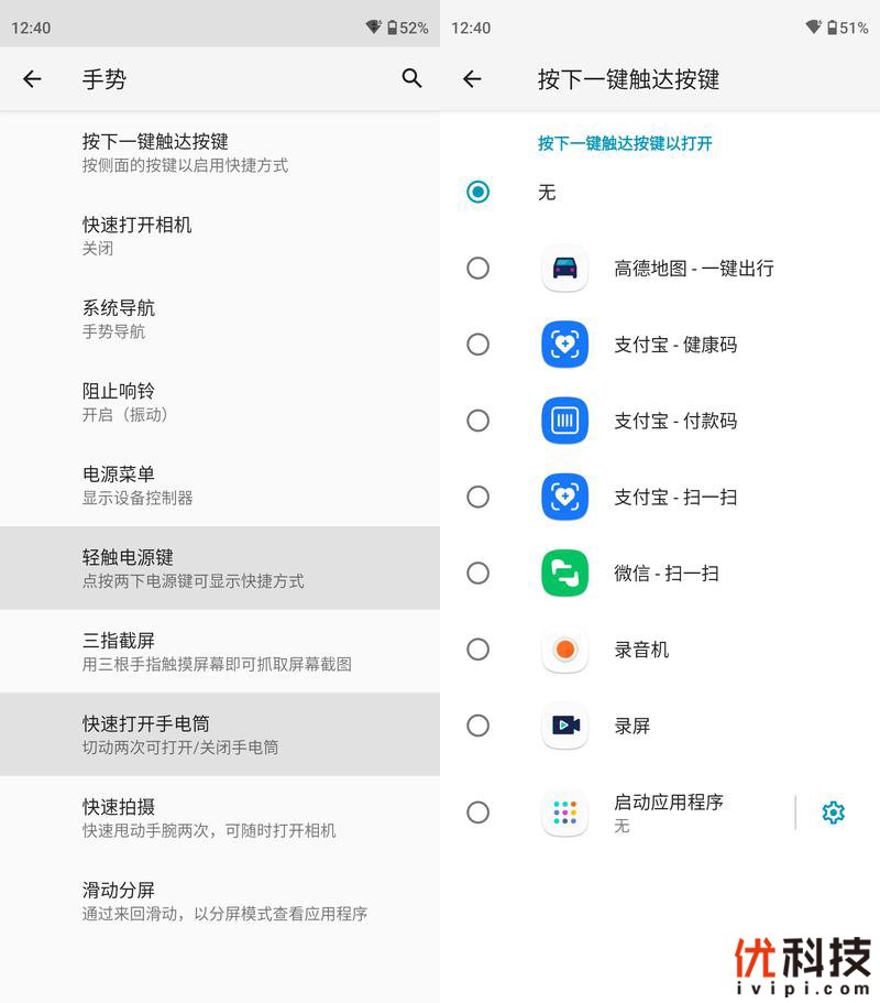 在系统内可以设定机身中框的一键触达功能,用户可以选择打开地图、扫一扫、录音机等常用功能,或者设定为启动应用程序,均支持自定义。另外在系统的手势功能内还具备多项便捷功能。