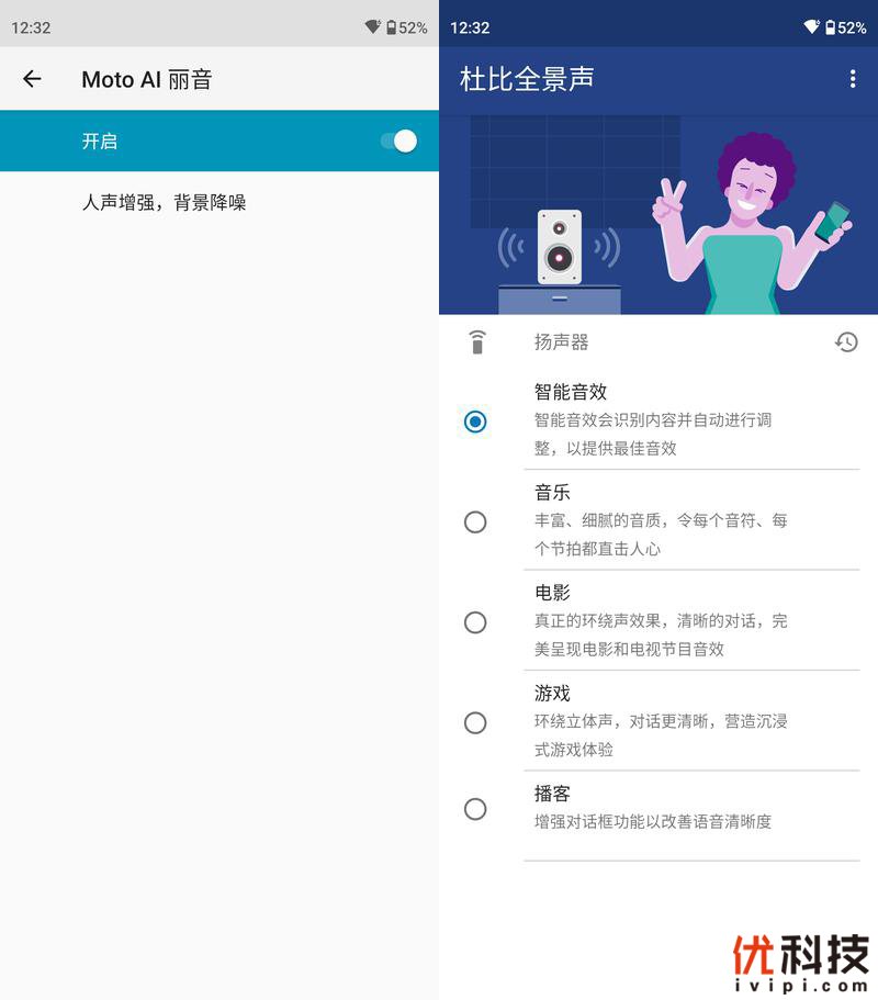 另外该机还支持MOTO AI丽音以及杜比全景声功能,开启之后可以很有效的人声增强,降低背景噪音,同时在杜比全景声的加持下,音质也是有着极大的提升,并且用户还可以自定义类型效果。
