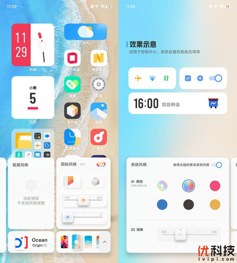全新设计的变形器内部新增了极简图标,还支持滑动调节图标的大小,并且支持更改图标颜色等个性化定制,另外在系统风格方面可以统一调节系统样式的颜色和圆角。