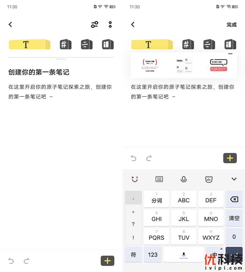 而全新的原子笔记则是更具有实用性,用户可以在列表页中直接拖拽给笔记添加标签,同时可以左右滑动快速选择段落便捷的进行内容排版,并且在原子笔记中还内置了非常丰富的效果包,整体操作更具有质感。