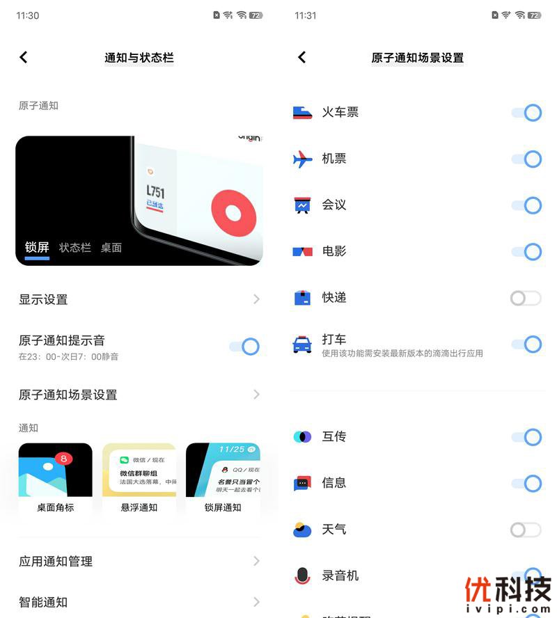 作为OriginOS最受好评的应用之一的原子通知也是升级不小,采用了更加丰富的色彩设计,提升重要信息的识别效率,而全新的胶囊通知则是在状态栏上更加直观的了解重要通知内容,另外用户可以在设置内对原子通知进行更加个性化的详细设置。