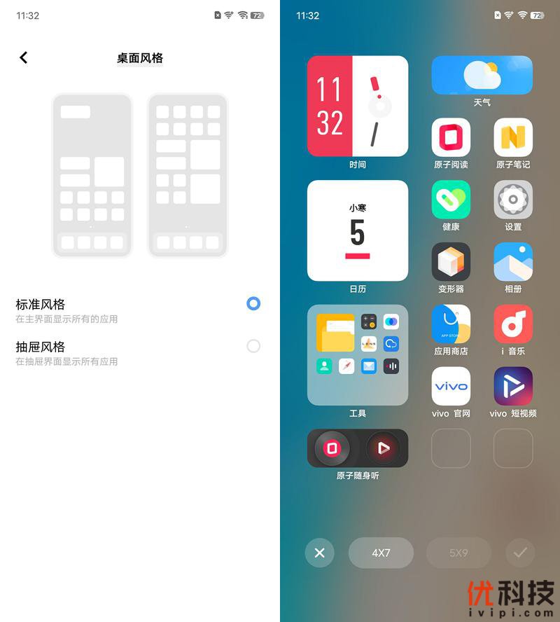 至于桌面风格方面,用户可以选择标准风格或者趋向于原生的抽屉风格,同时桌面图标的布局排列还有多项可选。