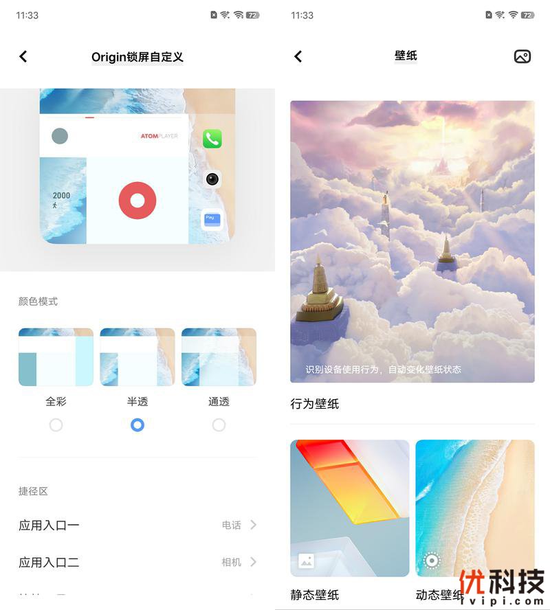 在锁屏设计方面,全新的OriginOS Ocean也是非常的有个性,用户可以设定锁屏区域的颜色通透模式,并且支持自定义捷径区的设置。在OriginOS Ocean的锁屏页面中用户可以设定更加有趣的交互体验,支持快速打开各种应用。而在壁纸方面此次也是增加了多款壁纸,全新的壁纸更加的生动自然,至于行为壁纸方面也是有着多项可选。