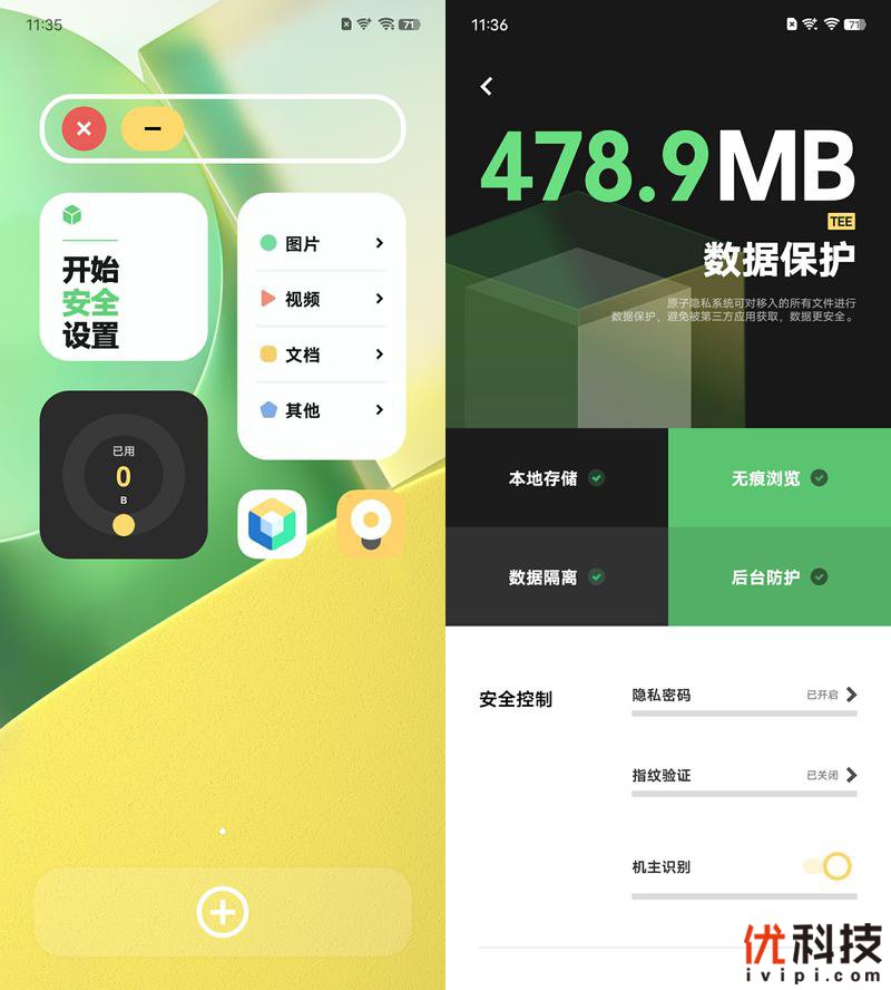 OriginOS Ocean内置原子隐私系统,用户可以将图片、音频、视频等文件放入其中,原子隐私系统可以在用户使用的过程中进行机主识别,若不是本人操作则会触发禁用操作,同时在原子隐私系统内还可以进行独立的网络连接、定位等权限控制,保证原子隐私系统和外界的隔离。