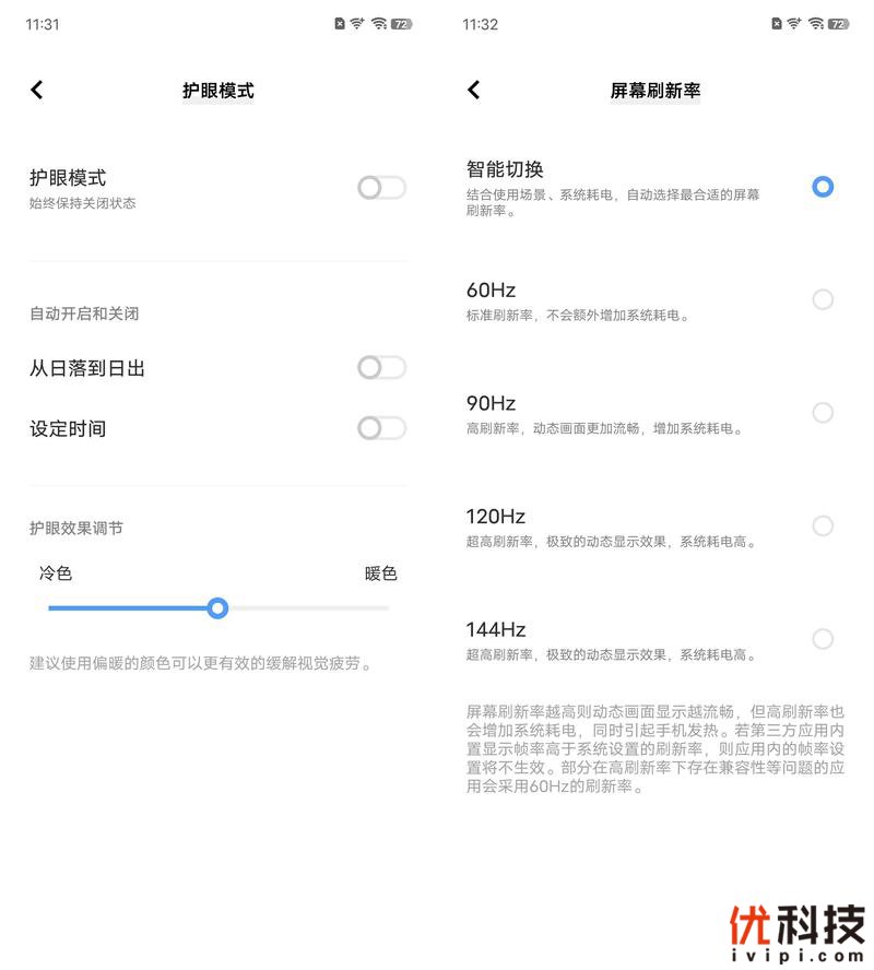 另外该机同样支持护眼模式以及暗色模式设置,用户可以手动开启护眼模式,或者开启自动开启功能,系统可以随着时间的不同跟进行开启和关闭,另外护眼效果还支持冷色和暖色的手动调节,至于屏幕刷新率方面则是具备智能切换、60Hz、90Hz、120Hz以及144Hz多档可选,用户可以根据自己的喜好来设定。