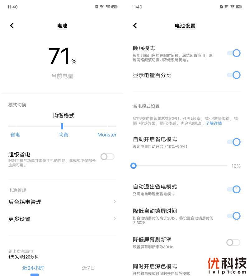 至于电池设置方面,用户可以手动切换手机的运行模式,同时还支持超级省电功能,开启后将会自动关闭部分应用以及功能达到超级省电的目的。而在电池设置中还支持睡眠模式,开启后可以很有效的提升手机的续航时长。