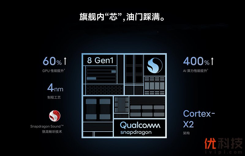 至于硬件配置方面,作为年度旗舰级新机,iQOO 9 Pro采用了全新一代骁龙8移动平台加持,全新一代骁龙8采用了最新一代的4nm工艺制程,在性能和功耗方面有着明显的提升,其中CPU采 用1+3+4三丛集设计,包括一颗3.0GHz的Cortex-X2超大核、 三颗2.5GHz的Cortex-A710大核和四颗1.8GHz的Cortex- A510小核,采用ARM v9底层架构,安全性、AI计算性能的全面提升,相比上代旗舰骁龙888全新一代骁龙8移动平台的峰值性能提升20%;在保持性能不变的前提下,功耗降低30%,由于搭载了全新设计的818MHz的Adreno图形处理器 和Spectra图像信号处理器,相比骁龙888在GPU性能最高提升60%,功耗降低25%。