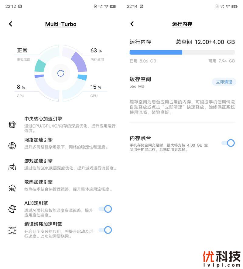 iQOO 9 Pro还支持最新版本的内存融合2.0,系统将ROM存储调度给RAM使用,应用启动速度更快。可实现8GB+4GB、12GB+4GB运存效果,同时配合着联合三星开发并首发碎片整理2.0,真正从手机初期使用开始就做到数据分类存储,减少数据碎片化。相对UFS深度文件碎片化时,碎片整理2.0使得文件碎片化概率大幅降低25%,擦除次数也同时降低,并使UFS的寿命进一步提升。配合着所搭载的Multi-Turbo 6.0系统通过调整CPU策略、优化框架和recover部分、智能调度资源和利用效率,实现帧率、游戏影音体验、系统流畅性稳定性、应用响应速度和散热等方面的全方位提升。