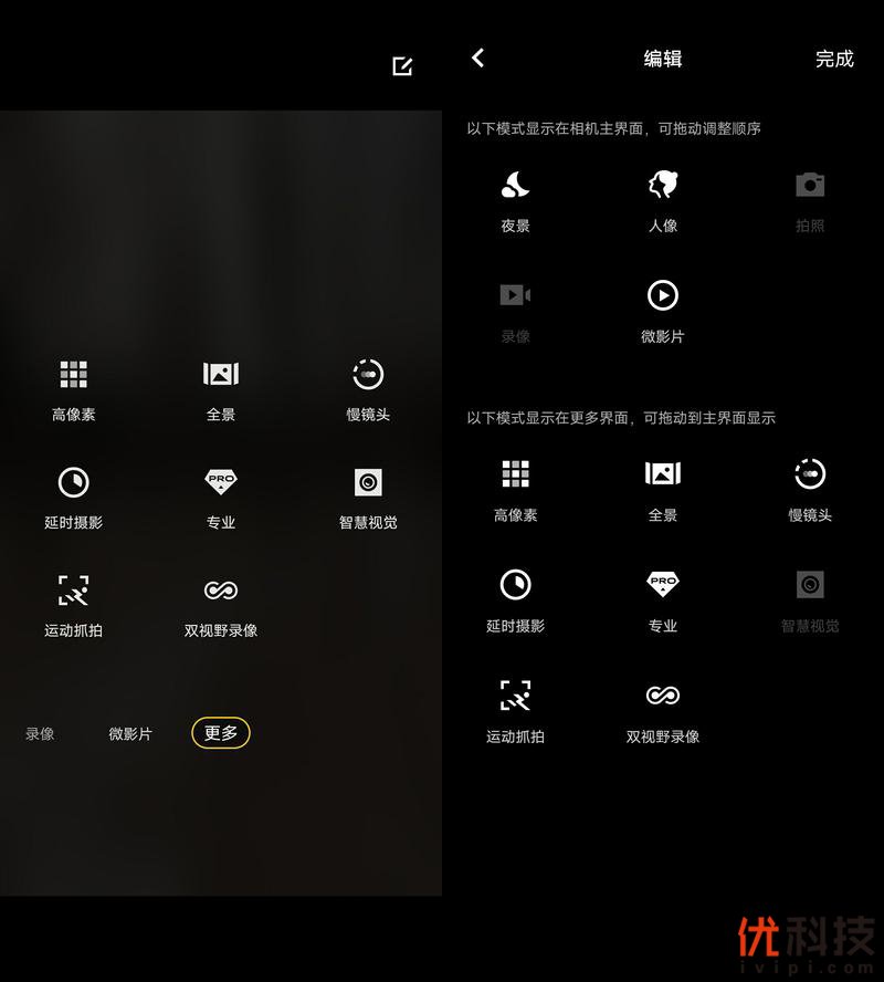 此外相机的模式功能还支持自定义编辑,用户可以将常用的相机模式调整到相机页面的第一屏位置,便于使用时快速上手。