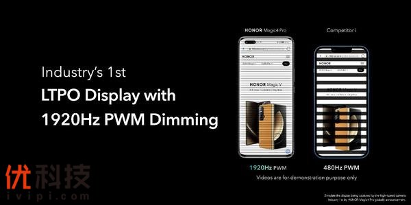 鉴于目前人们对手机的依赖程度越来越高,长时间观看手机屏幕会增加视觉疲劳度甚至引发用眼健康问题,荣耀和供应商通过底层驱动的深度合作,在荣耀Magic4系列上实现了1920Hz的高频PWM调光能力,这也是业界LTPO屏幕有史以来最高的调光规格。1920Hz高频PWM调光可以有效解决手机屏幕在低亮度场景下的屏幕闪烁问题,即使在弱光环境下也能为用户提供舒适的观看体验,有效降低长时间使用手机后的视觉疲劳感。
