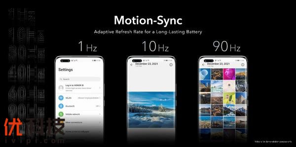 荣耀Magic4系列还在行业首发LTPO屏幕+1920Hz PWM高频调光技术,带来更为流畅的浏览体验和更为健康的护眼能力。荣耀Magic4全系采用最新一代LTPO屏幕,可以根据应用和操作智能调节动态屏幕刷新率,最低1Hz、最高120Hz以及多梯度的刷新率设置,无论用户是在玩游戏还是浏览网页,都能确保流畅、顺滑的观看体验。与此同时,为进一步提升视觉和触控体验,荣耀Magic4系列还基于LTPO屏幕首次采用自研MotionSync技术,该技术能够根据不同场景的画面渲染速度和手指触控操作,实时、快速、智能地调整屏幕刷新率,在满足用户对流畅舒适体验要求的同时,有效避免屏幕长时间处在高刷新率状态下的高电量损耗,保证更久的续航体验。