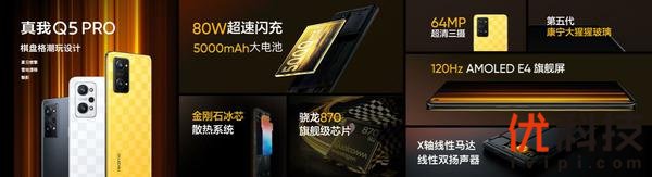 真我Q5 Pro定位千元闪充旗舰,首次将80W超速闪充下放到千元价位段,同时还带来了骁龙870旗舰芯片,和三星E4旗舰直屏,并首次在Q系列采用金刚石冰芯散热系统,带来同级最大面积的3D钢化VC液冷散热,全面保证旗舰性能释放。充电、续航、性能、屏幕全面升级的真我Q5 Pro,成为“千里挑一”的闪充机皇。