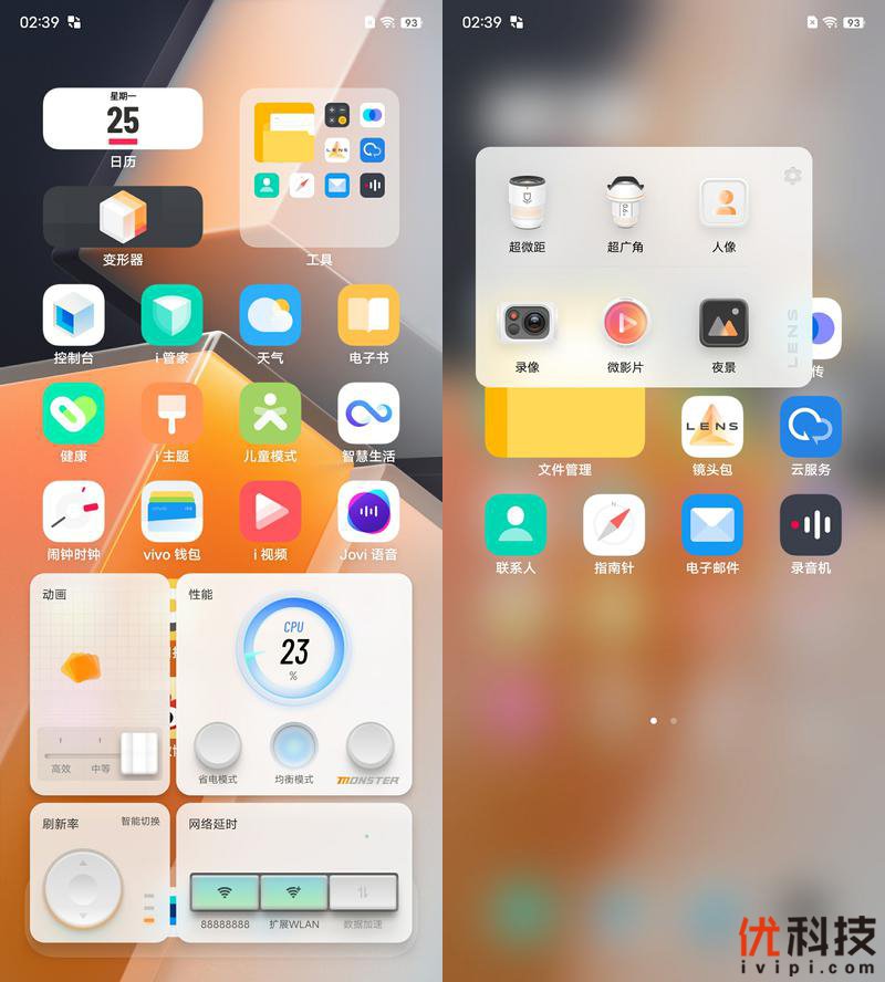同时依旧搭载了iQOO系列独有的控制台功能,用户可以直接设定系统的动画效果以及性能模式和刷新率与网络切换,很有效的提升了操控效率。而镜头包功能则是在桌面既可以直接进入到相应的相机功能当中,更加适合抓拍。