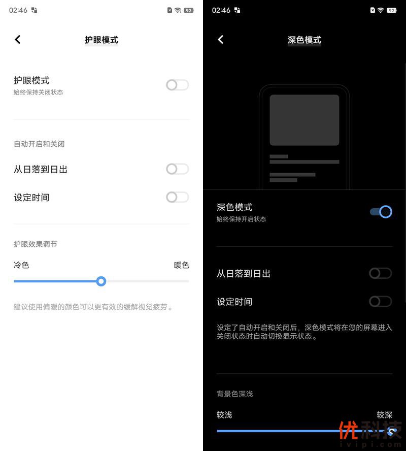 于系统显示方面,还支持护眼模式以及深色模式设置,用户可以手动开启护眼模式,或者开启自动开启功能,系统可以随着时间的不同跟进行开启和关闭,另外护眼效果还支持冷色和暖色的手动调节,至于深色模式的背景色深浅也支持手动调节。