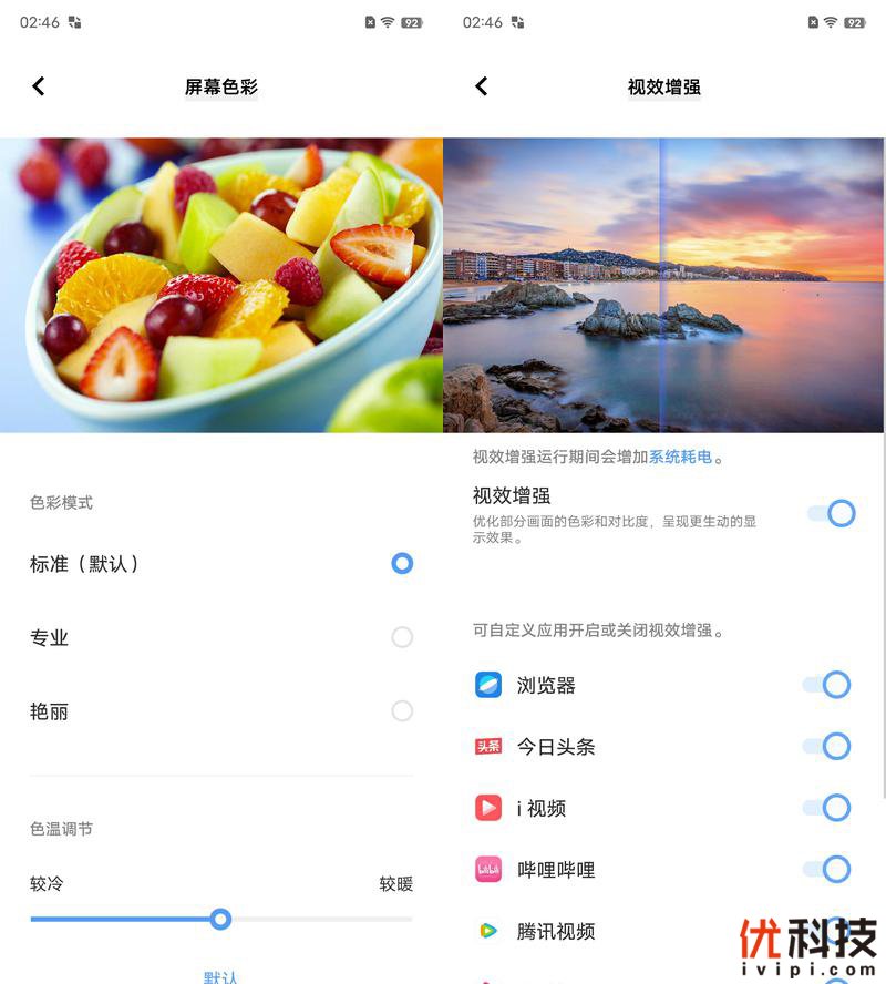 在屏幕显示效果方面,默认状态下为标准,同时还提供专业和艳丽两种色彩模式可供选择,至于色温方面还支持用户自定义调节,用户可以根据自身的喜好来设定,至于自适应环境色温也是非常的有效果,手机将智能调节屏幕色温来适应环境,给用户带来更加舒适的阅读体验。同时还具备视效增强功能,该功能可以优化部分画面的色彩和对比度,给用户带来更加生动的显示效果。