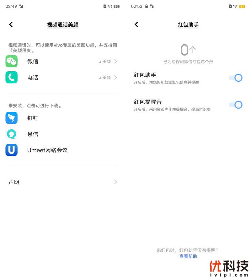 系统内依旧支持视频通话美颜功能,支持多款软件,例如微信、钉钉等程序均支持视频通话美颜效果,同时用户还可以手动调节美颜的程度。而系统内还保留了红包助手功能,开启该功能后系统将自动检测红包信息并提醒。