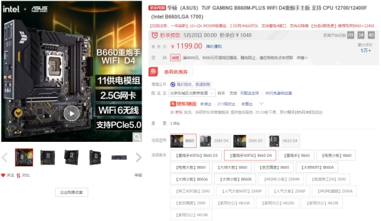 此外,若没有无线需求,可选择不带WiFi 6无线网卡的华硕B660重炮手D4主板,价格更亲民。目前闪购价999元,还可享6期免息福利。购买链接:https://item.jd.com/100031223666.html