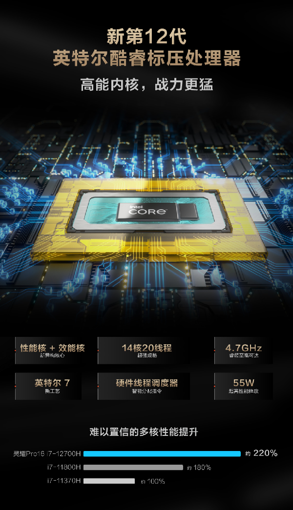 第12代标压处理器i7-12700H采用性能核+效能核新异构核心,拥有14核20线程的超强规模,其极致功耗释放可以达到85W,综合性能对比上一代提升高达220%。即使进行复杂的视频处理,依然能保持飞一般的流畅快感,肆意挥洒灵感,保证创作效果的同时极大地提升工作效率。