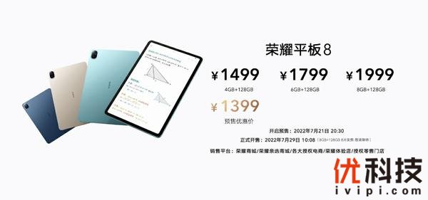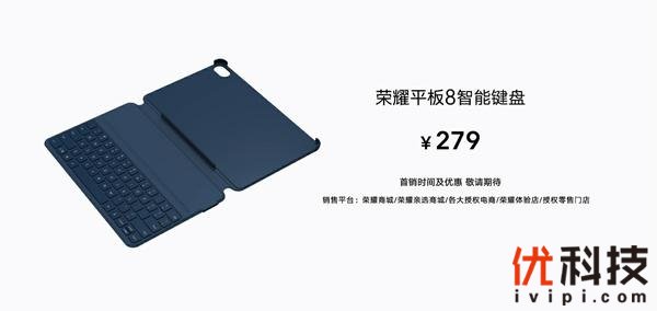 7月21日20:30,荣耀平板8在荣耀商城、荣耀亲选商城、各大授权电商,荣耀体验店和荣耀授权店同步开启预售,4GB+128GB版本官方售价1499元(预售优惠价1399元),6GB+128GB版本官方售价1799元,7月29日10:08正式开售,8GB+128GB版本官方售价1999元,将于8月开售。此次还发布了荣耀亲选推出的荣耀平板8智能键盘,这款键盘可还原笔记本的1.6mm高键程和18.8mm宽键距,打字回弹清晰不生硬,键盘尺寸舒适不局促,双手放上键盘无需适应,文字从指尖畅快输出,与荣耀平板8搭配,助力学习办公效率全面升级。荣耀平板8智能键盘官方售价279元。