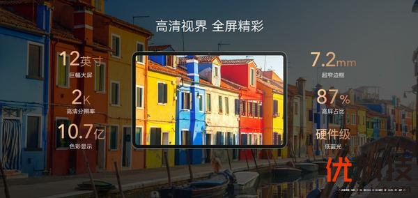 相较于其它平板电脑,荣耀平板8所配备的定制12英寸大屏最为吸睛,仅约7.2mm的四边超窄等宽边框,使其屏占比高达87%,真正做到了“大屏小黑边”的既视感。另外,2K分辨率、10.7亿色彩显示、更宽的5:3屏幕比例,让荣耀平板8的这块屏幕在用户观看时视觉体验更为舒适。