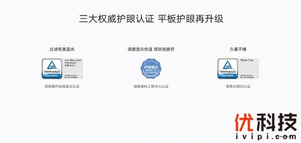 荣耀平板8通过了三重权威护眼认证,支持莱茵硬件级低蓝光,获得了莱茵无频闪认证以及国家眼科工程中心护眼认证。同时,荣耀平板8还适配了一系列软件护眼方案,并针对K12青少年人群推出“健康使用平板”功能,可对距离过近、躺姿观看、暗光环境及手持抖动等对视力有影响的不良使用姿态进行提醒,软硬兼备全面提升护眼能力,致力引领平板护眼标准再升级。