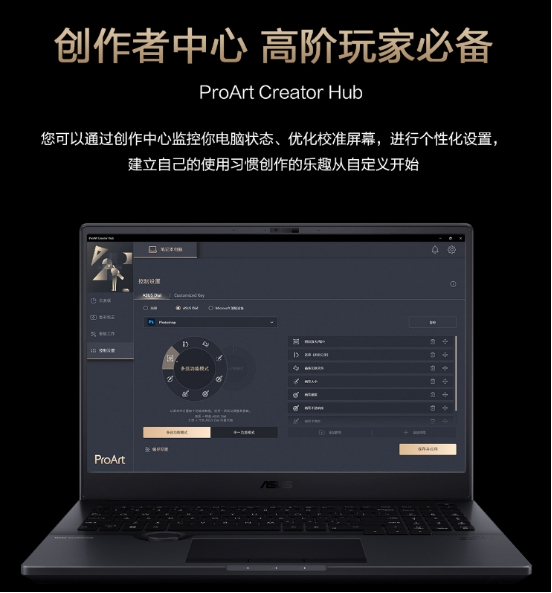 另外,你也可以通过系统自带的创作者中心软件(ProArt Creator Hub),调整华硕旋钮的具体功能,根据个人使用习惯实现旋钮的功能自定义。该软件目前兼容Adobe的大部分应用程序,让你打造一个真正自我个性化的创作空间。