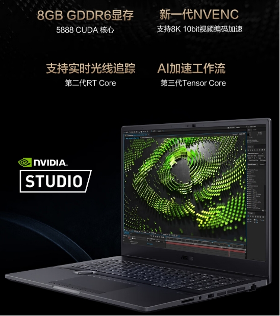 不仅如此,ProArt 创16 2022还有强大Nvidia GeForce RTX 3070Ti独立显卡的加持,简直是如虎添翼。其内置NVIDIA RTX Studio驱动程序,让软件运行时更加稳定、更快响应。全新Ampere架构,拥有5888CUDA核心以及8GB GDDR6显存。新一代NVENC支持8K超高清视频解码加速,剪辑超清视频游刃有余,大幅节约创作等待时间。配备第二代RT Core光追核心,支持实时光线追踪。第三代Tensor Core,AI加速工作流,在创作软件中效率更高。