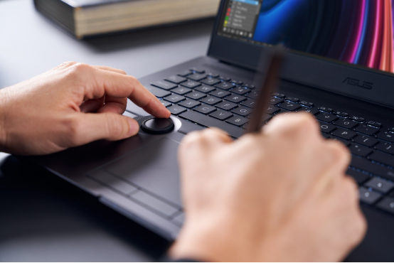 ProArt 创16搭载独创华硕旋钮,指尖即可精确操控创作软件,可兼容Photoshop、Premiere、Adobe illustrator和After Effects等多款Adobe应用程序。例如缩放笔刷大小,改变饱和度,调整图层透明度、快速撤消、调整屏幕亮度等,超70个功能任你操控,快速提升工作效率。另外,通过设备自带的创作者中心软件,还可以调整旋钮功能的个性化设置,让创作工作流程变得更加顺畅。