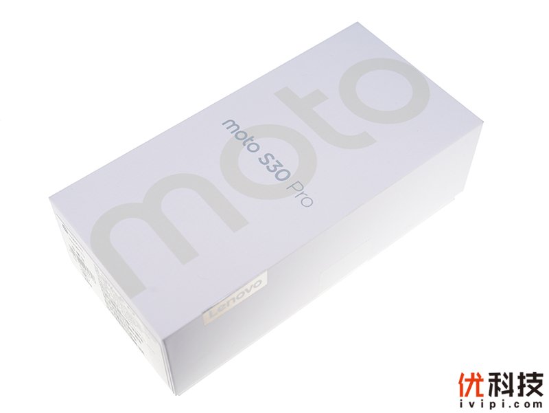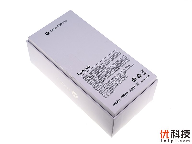 首先在包装设计方面,moto S30 Pro的包装盒非常的小巧,同时采用了低调的白色底色配以硕大的“moto”底纹,以及中间的产品标识“moto S30 Pro”,整体上还是非常立体的。而在侧边则是联想的logo。