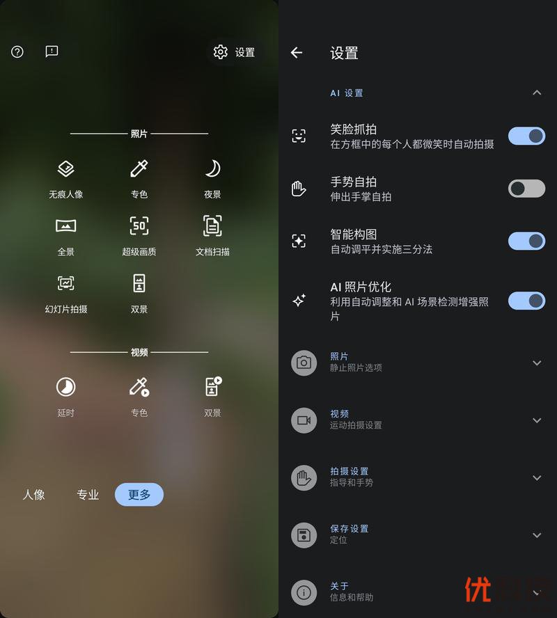 moto S30 Pro相机的功能也是比较全面,支持无痕人像、全景、幻灯片拍摄、文档扫描以及双景视频等实用功能,同时在设置中还可以开启笑脸抓拍、手势自拍等辅助功能。