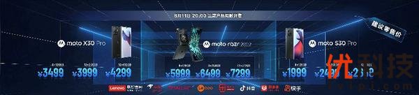 moto X30 Pro,8+128GB版本售价3499元,12+256GB版本售价3999元,12+512GB版本售价4299元。moto razr 2022,8+128GB版本售价5999元,8+256GB版本售价6499元,12+512GB版本售价7299元。moto S30 Pro,8+128GB版本售价1999元,12+256GB版本售价2499元,12+512GB版本售价2699元。