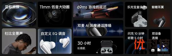 与真我10系列一同发布的,还有音质全面越级的TWS耳机产品真我Buds Air 3S。真我Buds Air 3S采用全新研发的蓝鲸振膜,11mm低音大动圈,支持杜比全景声Dolby atmos,为用户带来媲美千元级耳机音质的震撼听感。耳机仓采用了新颖的“乐”光宝盒设计,耳机杆则采用鲸鳍耳翼设计,佩戴更舒适稳固,还有30小时超长续航、自定义EQ调音、69ms游戏低延时等全方位的越级体验。