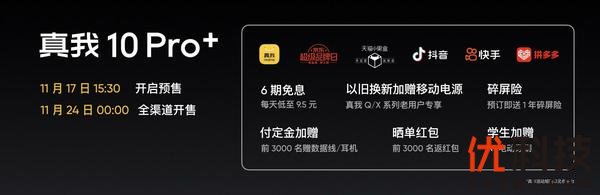 真我10 Pro+与真我10 Pro将于11月17日15:30正式开启预售,11月24日0点,线上线下全渠道正式开售。参与线上预售享6期免息分期,购买真我10 Pro+还可以加赠一年碎屏险,线下门店购机更有首销惊喜福利。