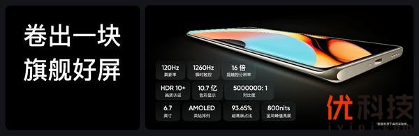 真我10 Pro+搭载了一块耗费亿元打造的2160Hz旗舰曲面屏。独家定制的61°黄金曲率,既保证了曲面设计的弧形之美,又带来近似无边界的视觉效果;全新的COP Ultra封装工艺,打造出2.33mm真我最窄下巴,带来超广的视野与无比惊艳的视觉震撼效果;显示素质方面,采用更清晰的旗舰类钻排列,支持120Hz十亿色显示、16倍触控分辨率、1260Hz瞬时触控等越级屏幕配置。