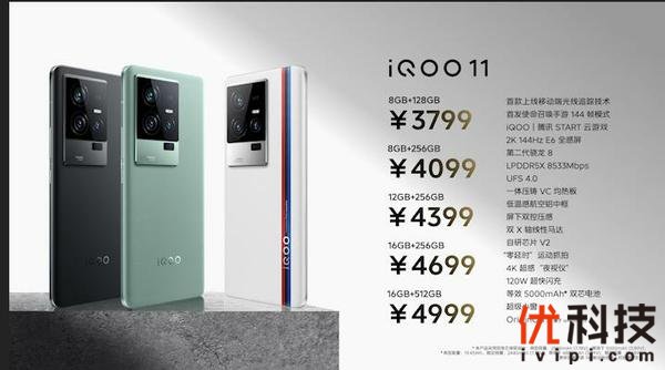 价格方面,iQOO 11共有5个版本可供选择,8+128版本售价3799元;8+256版本售价4099元;12+256版本售价4399元;16+256版本售价4699元;16+512版本售价4999元;预售和首销期内购机,线上最高享受24期免息,购机用户限时加享半年延保。