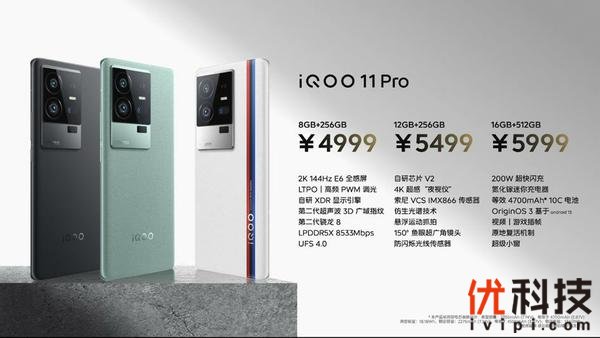 iQOO 11 Pro共有3个版本可供选择,8+256版本售价4999元;12+256版本售价5499元;16+512版本售价5999元;预售和首销期内购机,线上最高享受24期免息,购机用户限时加享半年延保。