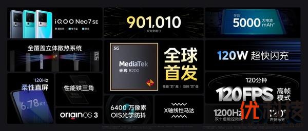 iQOO 11系列新品发布之后,“性能神机”iQOO Neo7 SE也同台登场,这是台积电4nm制程的天玑8200的全球首发。这款处理器采用全新SoC八核构架,主频高达3.1GHz,性能彪悍且能效比出众,与增强版LPDDR5和超频版UFS 3.1组成“性能铁三角”,辅以全覆盖立体散热系统,安兔兔跑分高达901,010分,堪称同级最强。iQOO Neo7 SE搭载120W 超快闪充,极速模式下至快10分钟就能将5000mAh超大电池从1%充至60%,同时支持亮屏快充。