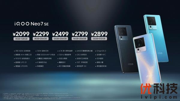 价格方面,iQOO Neo7 SE提供5个版本可供选择,8+128版本售价2099元、8+256版本售价2299元、12+256版本售价2499元、16+256版本售价2799元、12+512版本售价2899元,12月8日到12月12日期间,线上购机可享6期免息,加赠iQOO入耳式耳机。
