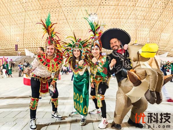 球迷穿着本国服饰在球场外助威,由X90 Pro+拍摄