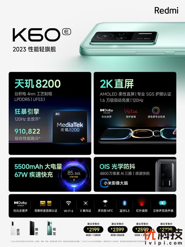 此次新增的杯型Redmi K60E主打「性能轻旗舰」,在爆款产品Redmi K50的基础上,完成两大传承和两大升级,传承备受好评的、同档唯一的2K柔性直屏以及5500mAh大电池,续航可达1.38天;升级全新的天玑8200处理器,同时采用与K60系列一脉相承的外观设计,颜值更进一步。