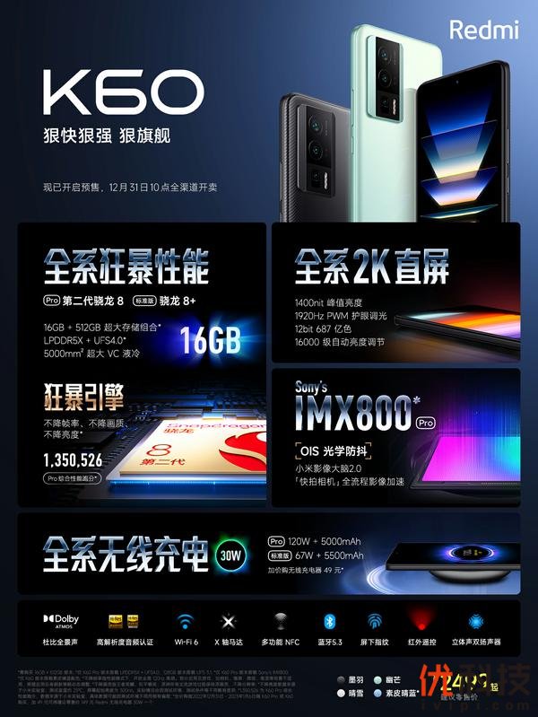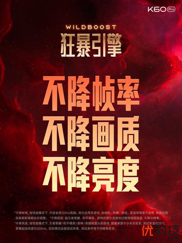 Redmi K60 Pro定位「旗舰性能之王」,搭载第二代骁龙8移动平台,在自研「狂暴引擎」加持之下,实现四大TOP游戏“三不降”:不降亮度、不降画质、不降帧率,并且拥有Redmi史上最大的5000mm² VC,游戏体验超越电竞旗舰;搭载与华星光电共研共创的首款旗舰2K直屏,顶级的硬件素质刷新国产屏新高度;获得小米影像能力下放,采用小米13同款IMX800主摄,堪称K系列最强影像;5000mAh+120W有线闪充+30W无线充电,是首款支持无线充电的Redmi旗舰手机。